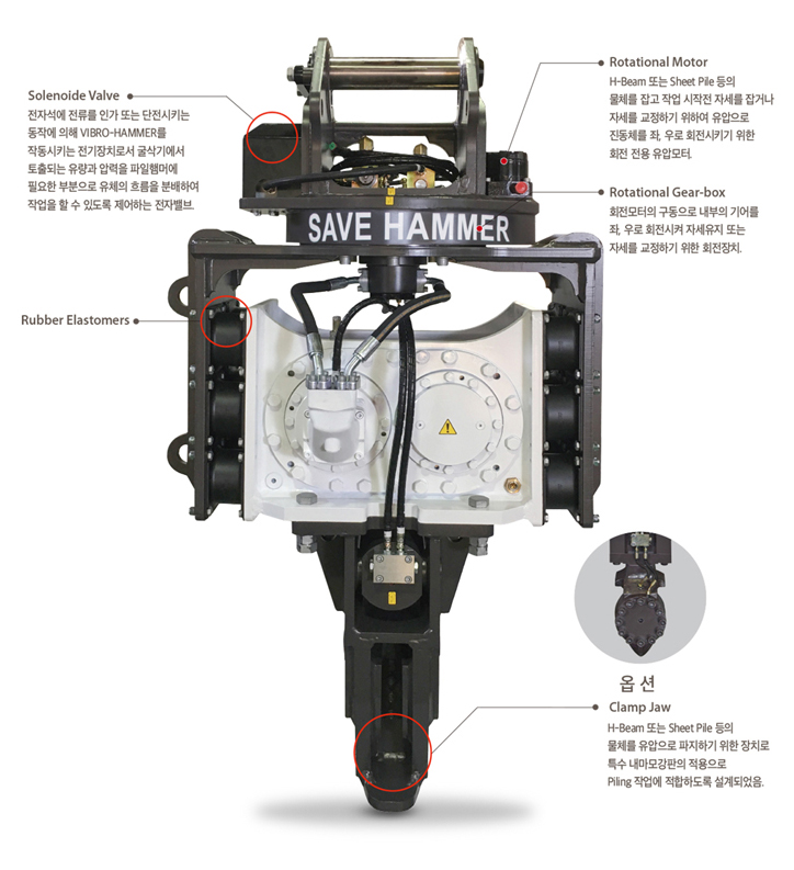 흙막이 공사에 필요한 H-BEAM, SHEET PILE 압입, 인출에 최적화된 장비입니다.
